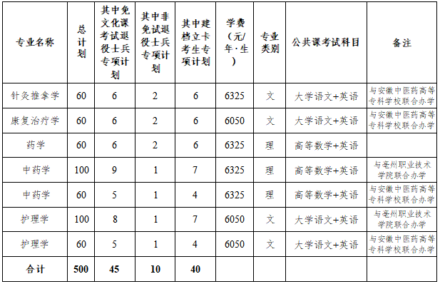 安徽中医药大学2025年普通高校专升本招生章程