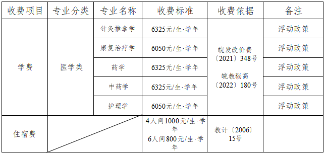 普通高校专升本学生的学费按照《安徽省发展改革委安徽省财政厅安徽省教育厅关于调整公办普通高校本科学费标准的通知》(皖发改价费〔2021〕348号)文件和《安徽省教育厅安徽省发展改革委安徽省财政厅关于加强国家级一流本科专业建设点建设工作的通知》(皖教秘高〔2022〕180号)文件标准收费。收费项目、收费标准经省物价管理部门和教育主管部门备案后执行。如有变动,以最新的物价管理部门和教育主管部门的文件为准。